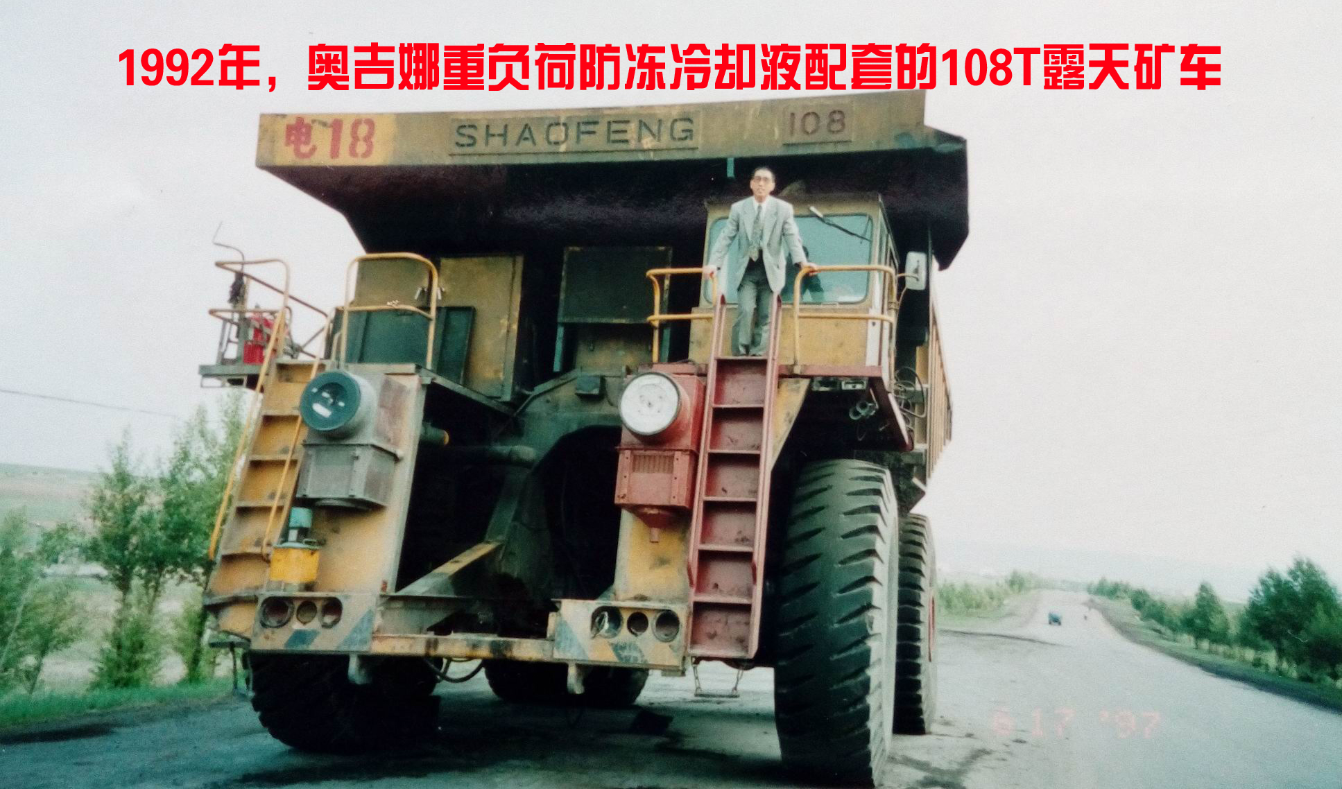 ? 1991年,在奧吉娜總裁魏國平博士的帶領(lǐng)下,奧吉娜研制生產(chǎn)出奧吉娜乙二醇基SCA型重負荷發(fā)動機防凍冷卻液,1992年,該產(chǎn)品配套露天礦重載自卸車。魏國平博士在裝配奧吉娜重負荷防凍液的108噸露天礦車上。