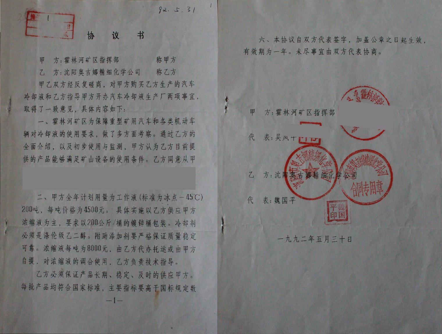 ? 1992年,奧吉娜與霍林河煤礦簽訂的協(xié)議(部分)。