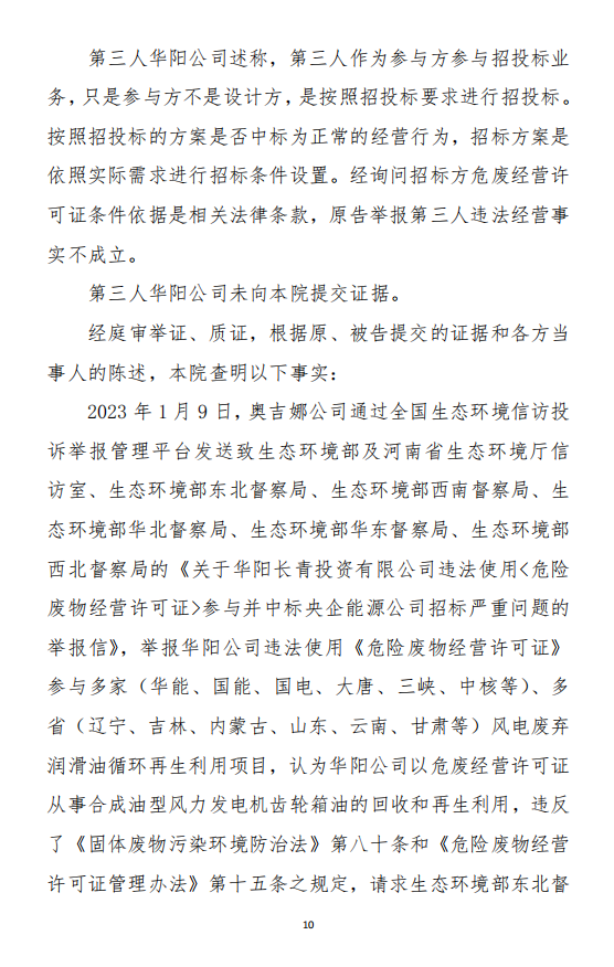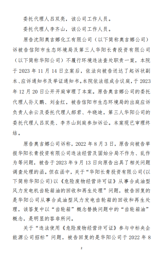 2023年9月13日,信陽(yáng)環(huán)境局向奧吉娜公司致《信陽(yáng)市生態(tài)環(huán)境局關(guān)于沈陽(yáng)奧吉娜化工有限公司舉報(bào)華陽(yáng)長(zhǎng)青投資有限公司違法經(jīng)營(yíng)及固始分局不作為、亂作為等問(wèn)題調(diào)查處理的函》。函中:一是,以“齒輪箱”替換“齒輪箱油”,偷換概念;二是,做出了廢風(fēng)電合成(齒輪)油不屬于危險(xiǎn)廢物的結(jié)論;三是,未發(fā)現(xiàn)固始分局存在不作為、亂作為的不當(dāng)行為。再次否定奧吉娜公司的舉報(bào)和投訴。
