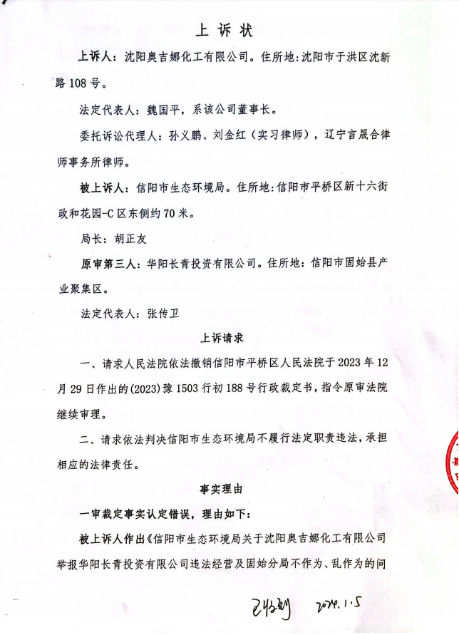 原告奧吉娜公司已于2024年1月5日上訴至信陽(yáng)市中級(jí)人民法院,下附二:《上訴狀》(3頁(yè))。