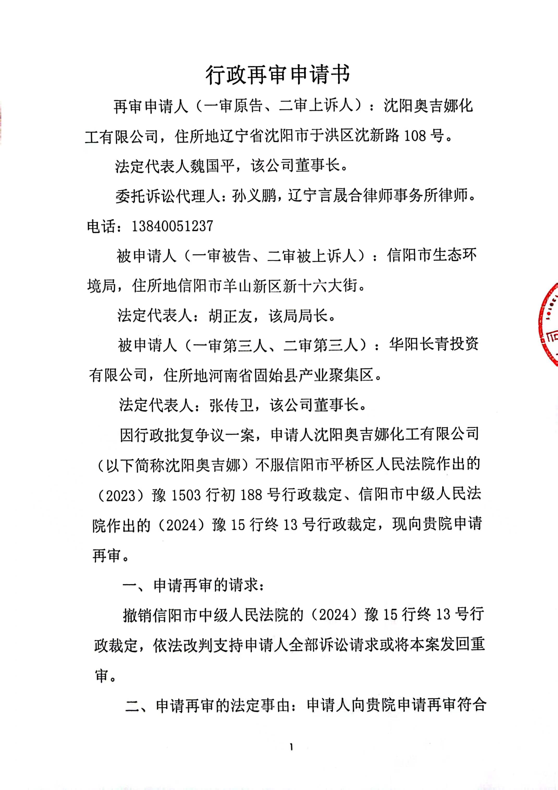 根據《行政訴訟法》第九十一條之規定,奧吉娜公司已于2024年4月19日向河南省高級人民法院遞交《行政再審申請書》(詳見下附二,共6頁),申請再審。