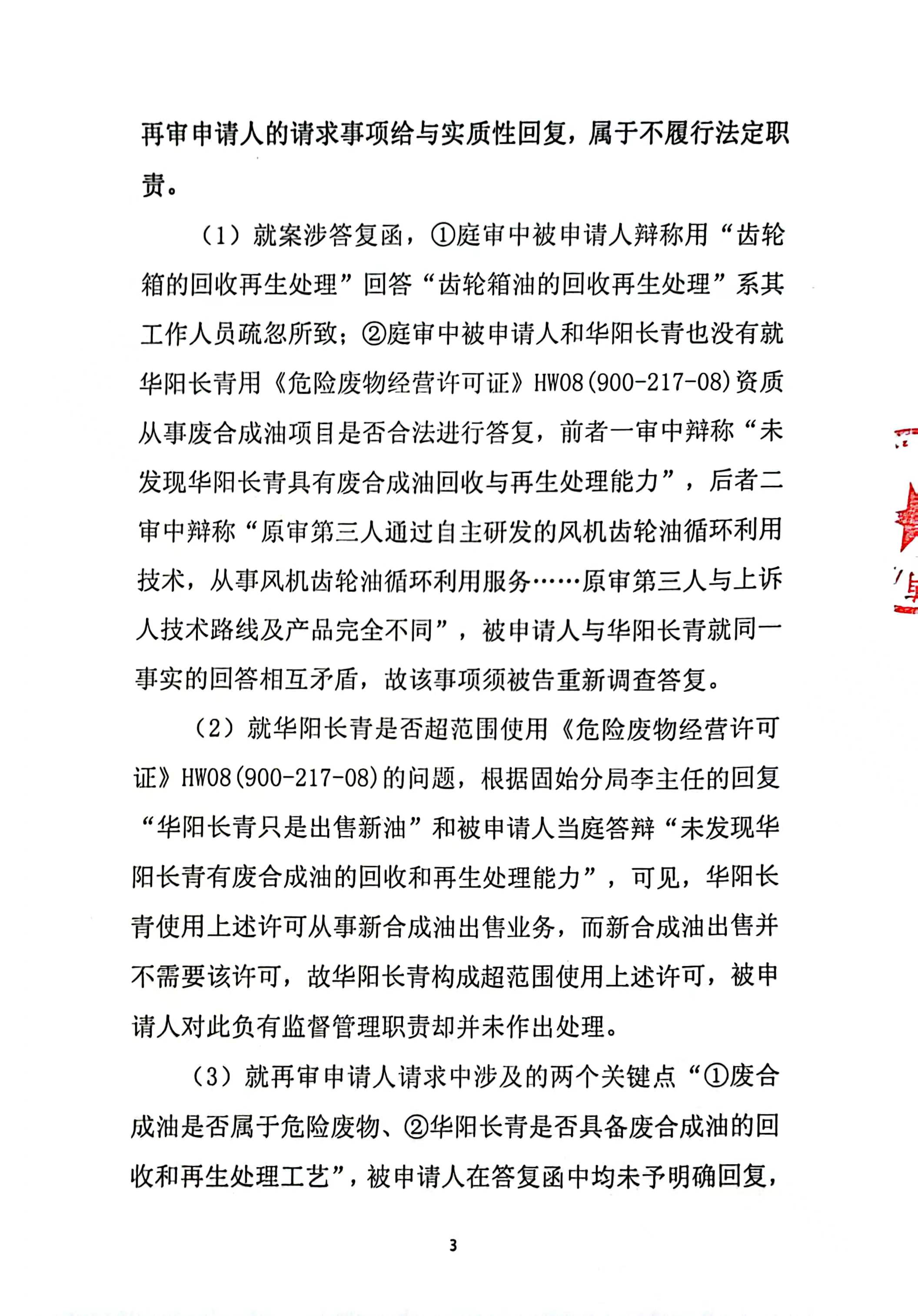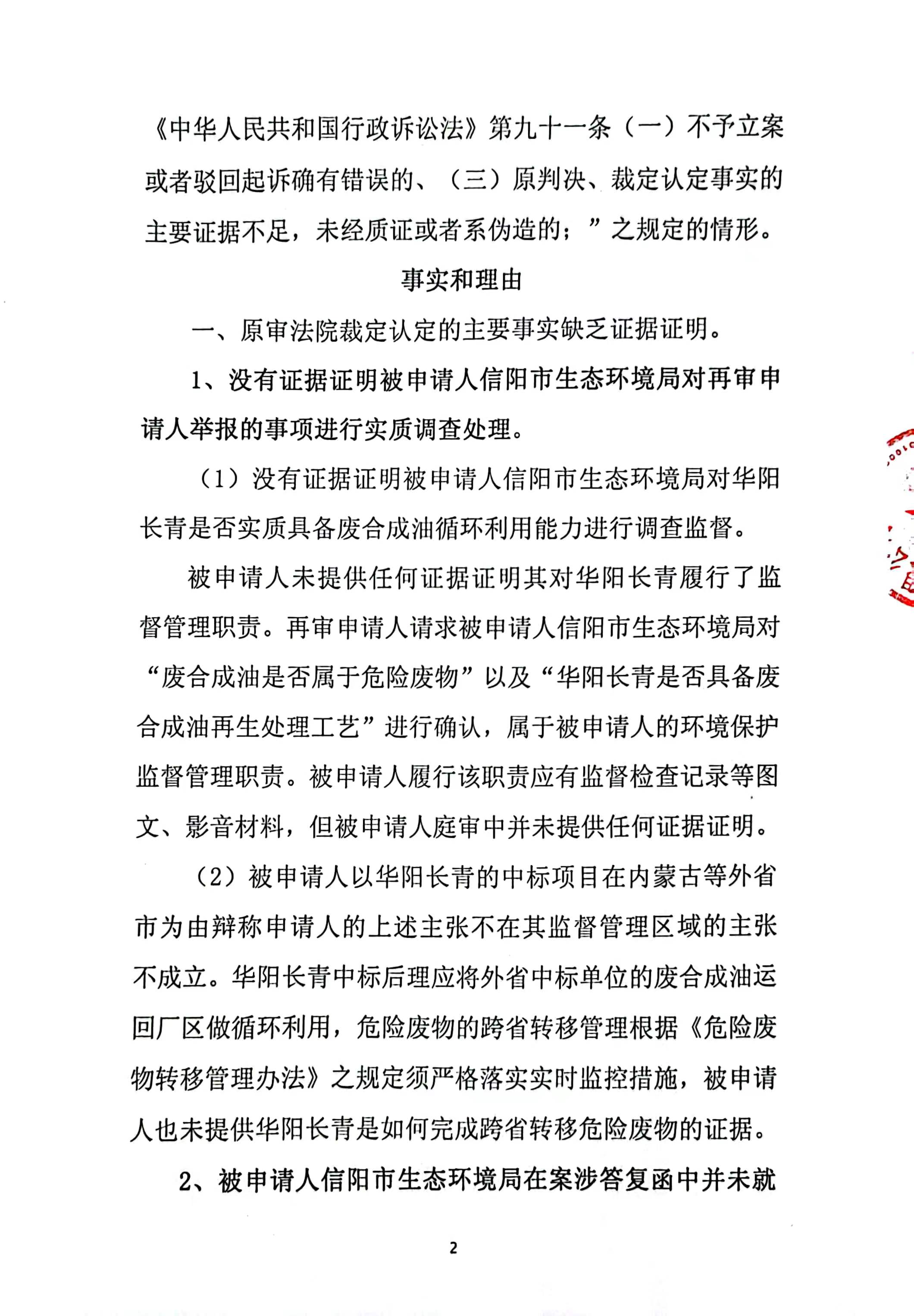 2、一審訴訟請求:請求人民法院判決撤銷被告作出的《信陽市生態環境局關于沈陽奧吉娜化工有限公司舉報華陽長青投資有限公司違法經營及固始分局不作為、亂作為等問題調查處理的函》;責令被告對原告向被告舉報華陽長青投資有限公司事項,限期進行重新調查和答復;判令被告認定的廢合成油不應按危險廢物有關規定進行管理違反法律規章規定,無效。