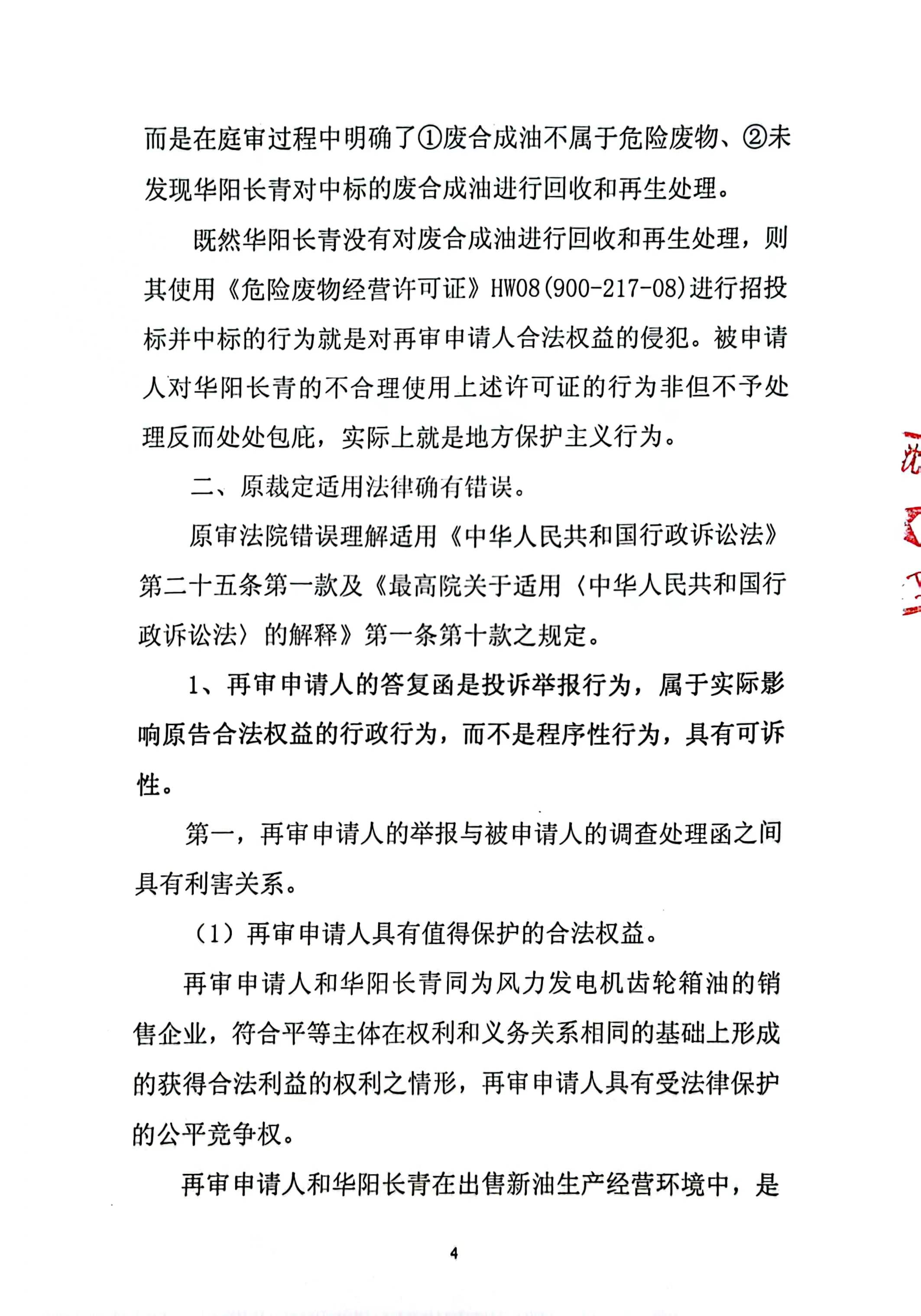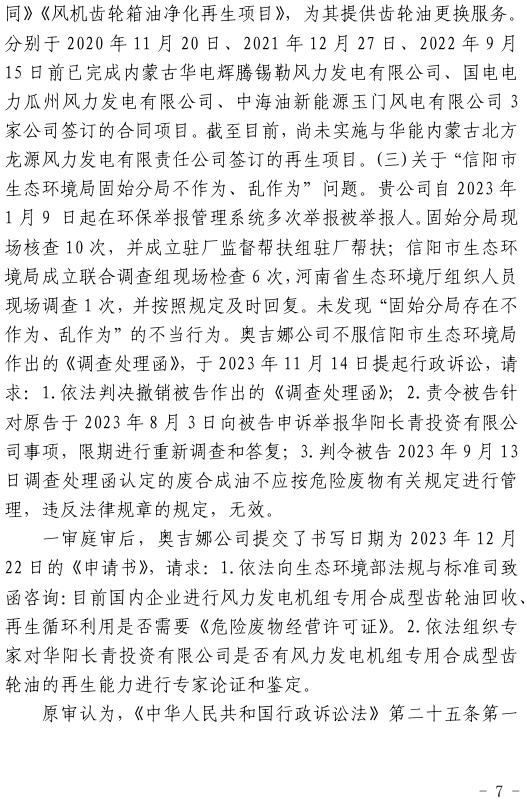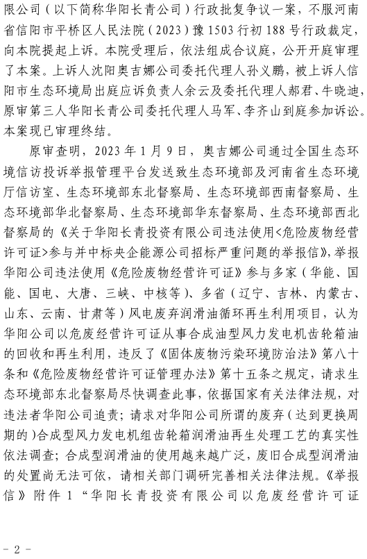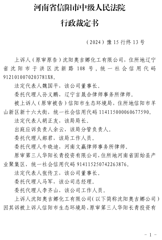 中國風電潤滑油民營企業沈陽奧吉娜化工有限公司(下簡稱:奧吉娜公司或上訴人)訴信陽市生態環境局(被上訴人)和第三人華陽長青投資有限公司(下簡稱:華陽長青公司)行政訴訟案,河南省信陽市中級人民法院于2024年4月2日作出二審行政裁定:駁回上訴,維護原裁定。