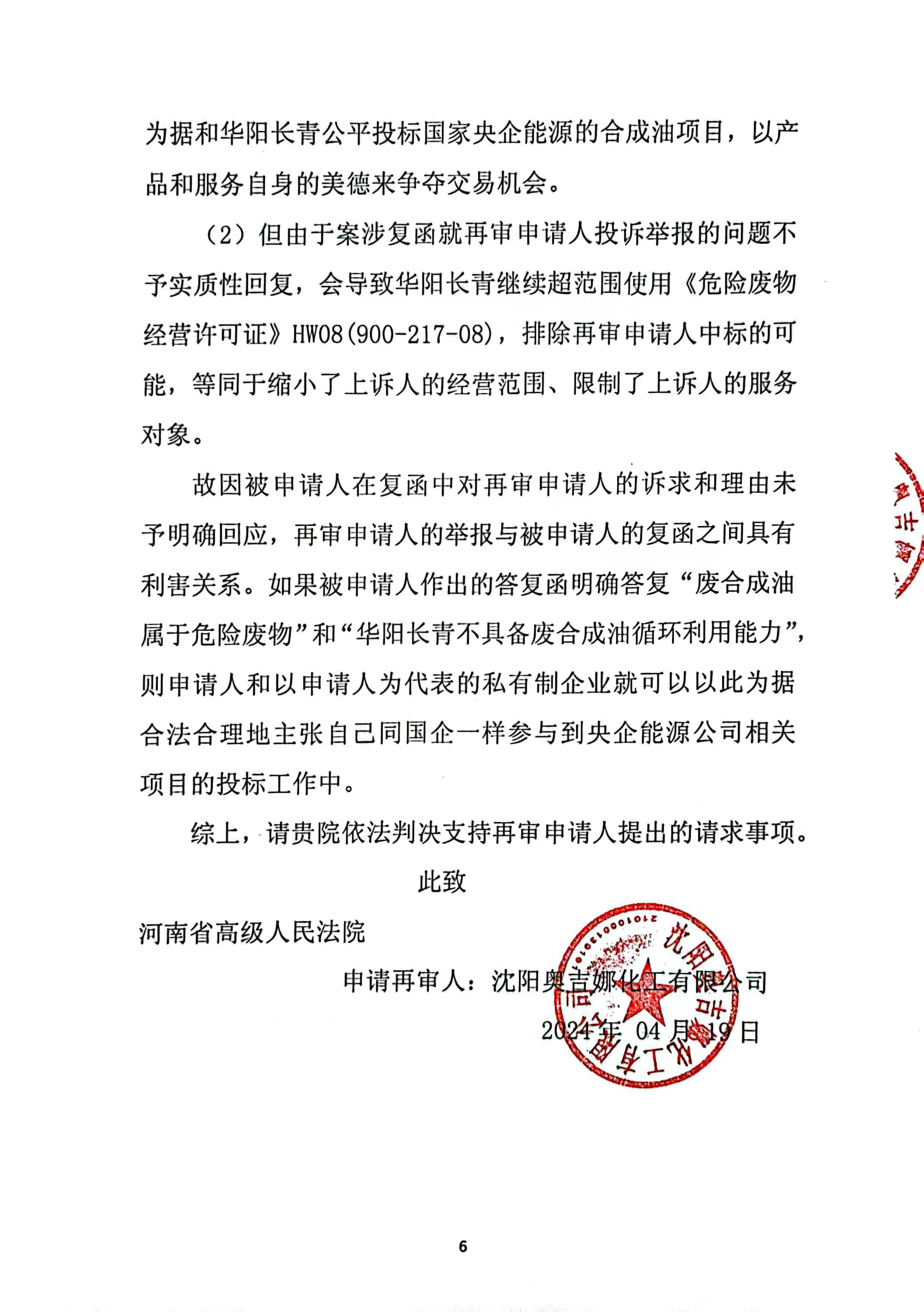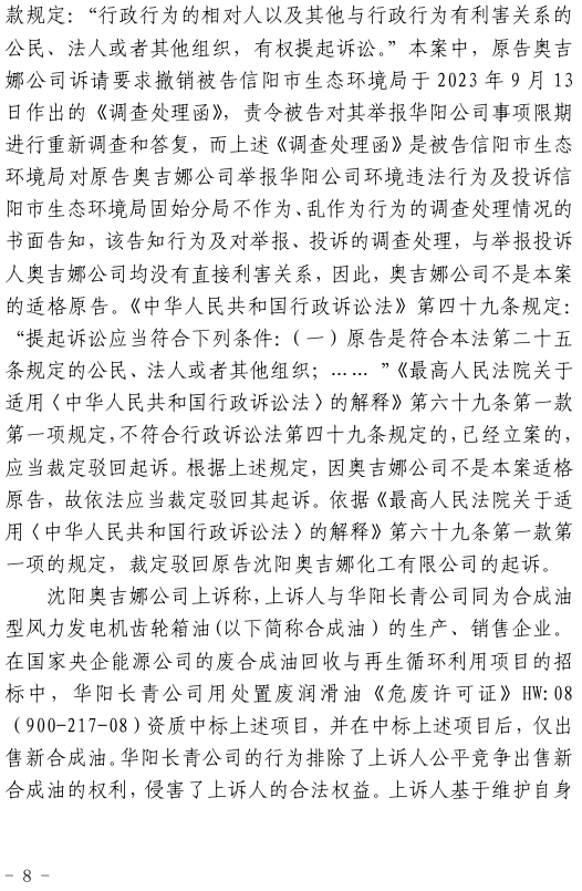 2023年10月18日,奧吉娜公司依據《行政訴訟法》和《行政訴訟法解釋》,將信陽市環境局和第三人華陽長青公司訴至信陽市平橋區人民法院,請求法院:1、判決撤銷被告作出的《信陽市生態環境局關于沈陽奧吉娜化工有限公司舉報華陽長青投資有限公司違法經營及固始分局不作為、亂作為等問題調查處理的函》;2、責令被告針對原告于2023年8月3日向被告申訴舉報華陽長青投資有限公司事項,限期進行重新調查和答復;3、請求人民法院判令被告2023年9月13日調查處理函認定的廢合成油不應按危險廢物有關規定進行管理,違反法律規章的規定,無效。