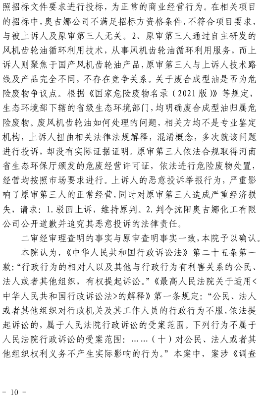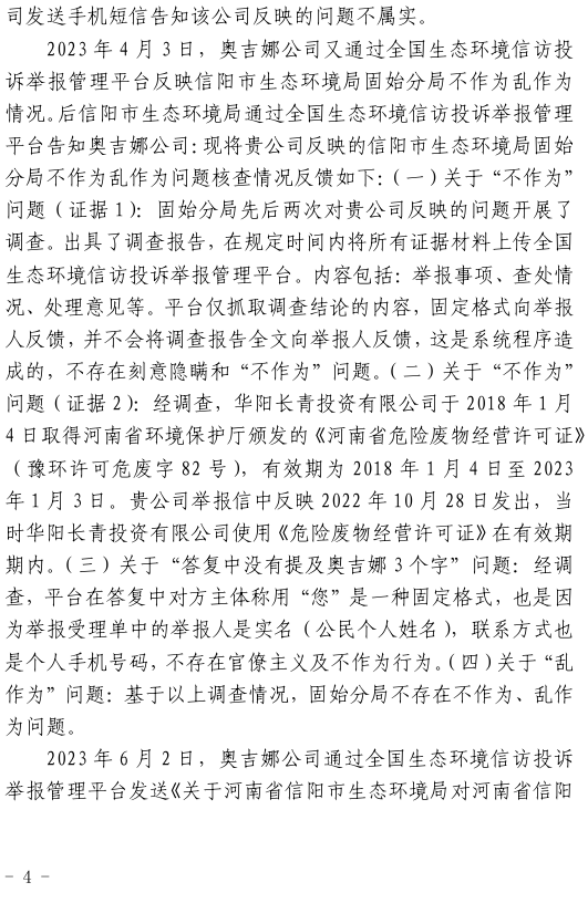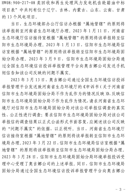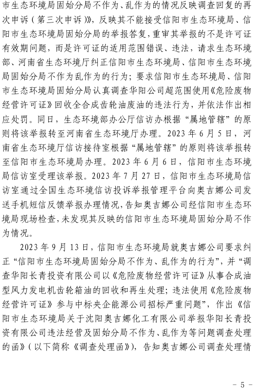 2023年3月9日,奧吉娜公司收到固始分局通過12369環境信訪平臺的短信答復:“反映問題不屬實”。3月10日,奧吉娜公司向固始分局負責人電話詢問,其解釋稱:經調查核實,華陽長青公司沒有再生風電潤滑油銷售,出售的是新油。否定了奧吉娜公司的舉報內容。對此,奧吉娜公司表示強烈不滿。3月11日,奧吉娜公司向環境部投訴固始分局的不作為和亂作為。2023年5月26日,奧吉娜公司收到12369環境信訪平臺的短信答復。答復部門為信陽環境局。令人啼笑皆非的是,答復稱,華陽長青的許可證有效期沒有問題,與舉報內容風馬牛不相及。2023年6月13日,奧吉娜公司再次向環境部提出申訴,指出,奧吉娜舉報的不是許可證有效期問題,而是許可證的適用范圍錯誤、違法。2023年7月27日,奧吉娜公司收到回復稱,經信陽市生態環境局現場檢查,未發現固始分局不作為情況。2023年8月3日,奧吉娜公司向河南省生態環境廳(以下稱:環境廳)舉報信陽環境局包庇固始分局的行為。環境廳對此高度重視,有關處長和奧吉娜公司負責人進行了面談。2023年9月13日,信陽環境局向奧吉娜公司致《信陽市生態環境局關于沈陽奧吉娜化工有限公司舉報華陽長青投資有限公司違法經營及固始分局不作為、亂作為等問題調查處理的函》。函中:一是,以“齒輪箱”替換“齒輪箱油”,偷換概念;二是,做出了廢風電合成(齒輪)油不屬于危險廢物的結論;三是,未發現固始分局存在不作為、亂作為的不當行為。再次否定奧吉娜公司的舉報和投訴。
