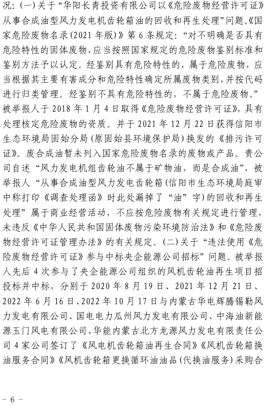 奧吉娜公司在參與各央企風電潤滑油招投標采購中發現,注冊于河南省信陽市固始縣的華陽長青投資有限公司(以下稱:華陽長青公司),憑借其持有的《危險廢物經營許可證》,屢次以“風電齒輪油再生利用”的名義中標。然而,奧吉娜公司發現,華陽長青公司的《危險廢物經營許可證》適用范圍并不包含合成型廢風電齒輪油,屬于違規使用,涉嫌違反《環境保護法》。于是,2022年10月18日,奧吉娜公司依法向國家生態環境部(以下稱:環境部)進行舉報。按程序,舉報調查由信陽市生態環境局固始分局(以下稱:固始分局)辦理。