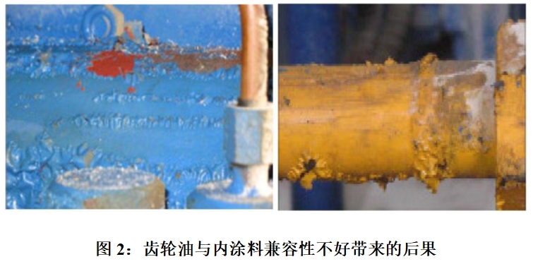 如果齒輪油和涂料兼容性不好,會導(dǎo)致內(nèi)涂料松弛堆積甚至懸浮于齒輪油中,從而無法起到防腐蝕的作用,堵塞過濾器,甚至?xí)s短換油周期。圖2為內(nèi)涂料與齒輪油兼容性不好的實例。
