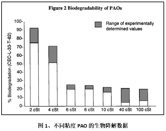 隨著海上風電機組向大功率機型發展,風機變速箱的用油量也隨之增加。目前風電機組用變速箱齒輪油多為PAO型(聚α-烯烴)合成油,其生物降解能力有限,有數據表明,風機齒輪油中的高粘度PAO其生物降解率小于20%(見圖1),一旦齒輪油發生傾瀉或以其它形式進入海洋環境中,會對周圍的水域造成嚴重威脅和不同程度的破壞,直接影響海洋生態中的動植物。因此,提高風電機組變速箱齒輪油的生物降解性對于海上風力發電機組來說有著非常重要的意義。